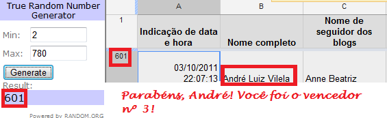 Como vocês sabem, esteve rolando entre 6 blogs, incluindo o NPQ, uma promoção que daria 5 livros e um kit de papelaria a três ganhadores que entrassem no sorteio. As inscrições seriam válidas até hoje, dia 11 de outubro, ao meio-dia. Alcançamos o número de 780 válidas, o que deixou todas muito contentes! Confiram agora os resultados, devidamente conferidos e confirmados.